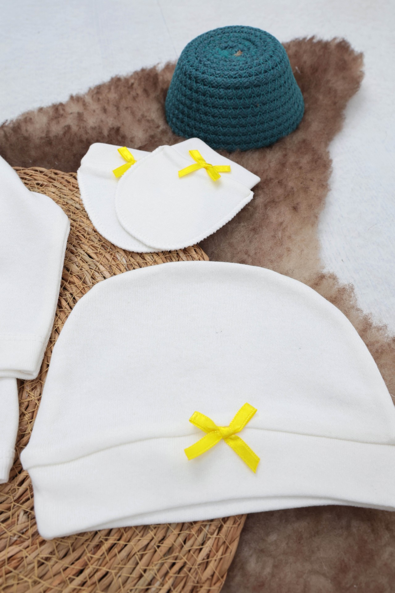 - Paket İçeriği: 1 Adet Çıtçıtlı bebek Ceketi, 1 adet Patikli Pantolon, 1 adet Şapka, 1 adet lastikli Önlük, 1 çift Eldiven